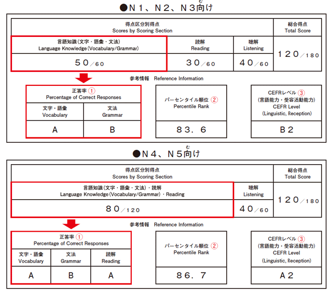 考试结果按以下得分分类来表示。N1、N2、N3的得分分类有"语言知识(文字、词汇、语法)" "阅读" "听力"3种。N4、N5的得分分类有"语言知识(文字、词汇、语法)、阅读"与"听力"2种。