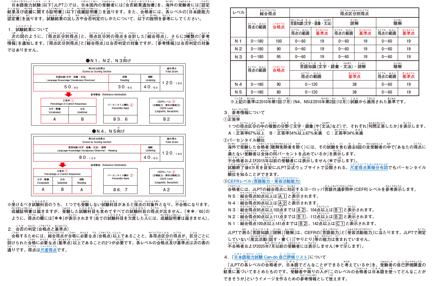 N1〜N3とN4・N5は、得点区分が異なります。各レベルの合格点及び基準点は下の表のとおりです。
